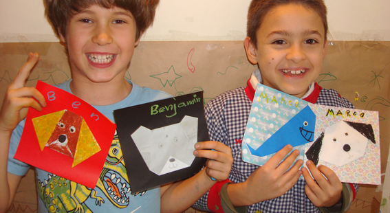 ¿Podemos hacer una ballena o un perro con un mismo trozo de papel cuadrado? Parece magia pero se llama 'origami' o 'papiroflexia'. Los niños lo pudieron comprobar doblando el papel por determinados sitios, prestando atención al hacer los pliegues. Y terminaron pegando o dibujando ojos y bocas.